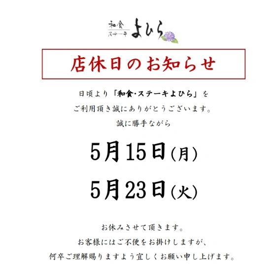 和食•ステーキよひら🥩【5月店休日のお知らせ】お客様にはご迷惑をおかけ致しますがご理解の程宜しくお願い致します。#和食ステーキよひら #よひら #長崎よひら #和食よひら #ステーキよひら #長崎市和食 #会席料理 #和食 #和食ランチ #ステーキ長崎 #ステーキ #長崎和牛 #鉄板焼きステーキ #長崎鉄板焼 #ながさき和牛 #鉄板焼カウンター#グルメ #ランチ #ディナー #長崎グルメ #お祝い #長寿祝い #子供のお祝い #庭が見えるステーキカウンター #庭園 #庭が見える個室 #個室 #ながさきで心呼吸の旅 – from Instagram
