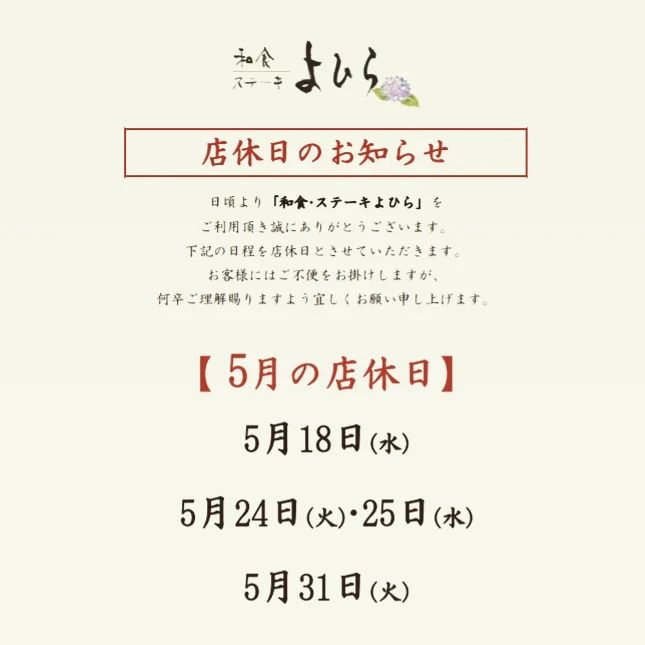 和食•ステーキよひら🥩【5月店休日のお知らせ】お客様にはご迷惑をおかけ致しますがご理解の程宜しくお願い致します。感染対策万全に、皆さまのお越しをお待ちしております。#よひら #長崎よひら#和食よひら #ステーキよひら#長崎市和食 #会席料理 #和食#ステーキ長崎 #ステーキ #長崎和牛 #鉄板焼きステーキ #長崎鉄板焼 #ながさき和牛 #鉄板焼カウンター#グルメ #ランチ #ディナー #長崎グルメ#お祝い #長寿祝い #子供のお祝い #庭が見えるステーキカウンター #庭園 #庭が見える個室 #個室#GoToEat長崎#感染症対策実施中です #ながさきコロナ対策飲食店認証店 #ながさきコロナ対策飲食店認証制度 #teamNAGASAKISAFETY – from Instagram